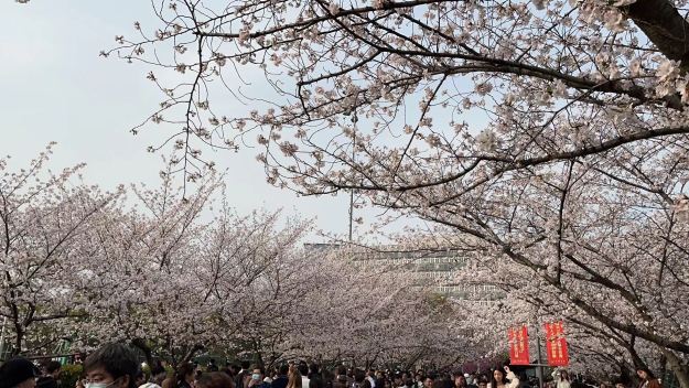 その後、同慶の桜前の庭園でビールで乾杯をしながらの桜鑑賞、さらに市内の名所になっているキャンパス内の桜花大道へ移動し、約100mにわたる満開の桜並木を堪能しました。